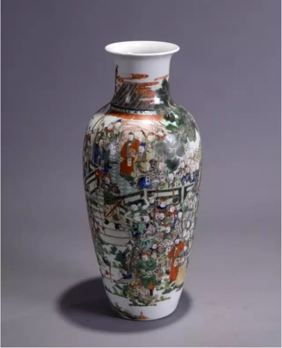 瓷质。撇口,直颈,溜肩,腹渐敛,圈足。通体施釉,腹壁以五彩绘主题图案《水浒传》一百单八将。该器胎体轻薄、胎质细腻。人物绘画笔触生动,细致入微。画面先用墨彩勾勒,再填以红、绿、紫、赭、墨等色彩,颇显典雅。