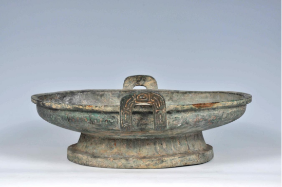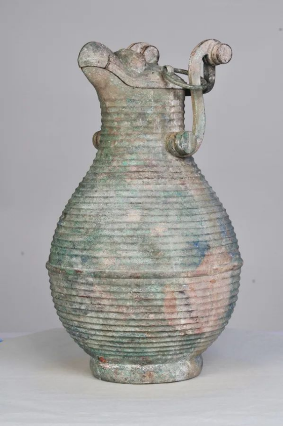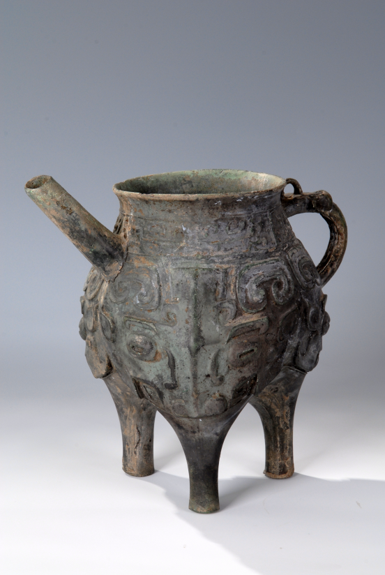 1992年3月发现于潍坊昌邑县塔尔堡镇上河头村。青铜质。三足,裆及底腹部附有浓重的灰垢,是由于长期调酒、温酒烧熏所致。束颈,圆沿外卷,颈部饰夔凤纹三组,每组两两相对,四周有凸弦纹作框栏。鼓腹,最大腹径居中,裆微内收,腹部饰三组高浮雕饕餮纹,浑厚典雅、富丽古朴。三柱足作大象垂鼻触地状,极为形象生动。扳作牛首状,双角歧出,两耳翼分,两目瞠圆。牛首上侧正中近口沿处有桥形钮,为挂连器身与器盖间铜链之用。筒状流斜出于上腹部,通长9.3厘米。铭文“登(“邓”之初写)公尊彝” 四字铸在扳下器壁上,形体挺秀,字口整饬。时代为商代晚期,是目前存世最早的邓国青铜器。