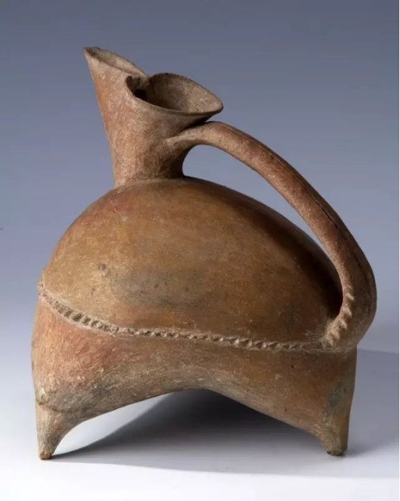 夹细砂红褐陶。鸟喙形短流,侧视呈三角形,口微侈,喇叭形细短颈,扁圆形腹肥大,低裆,矮肥足,桥形长鋬;颈下部流前饰一丁纹,鋬上饰一弦纹,下端两侧饰数道较深压印纹,腹部与把手下端连接处饰一周附加堆纹。该器物起身低矮,似一只伏于地上正仰望高空的肥硕大鸟,造型独特优美。