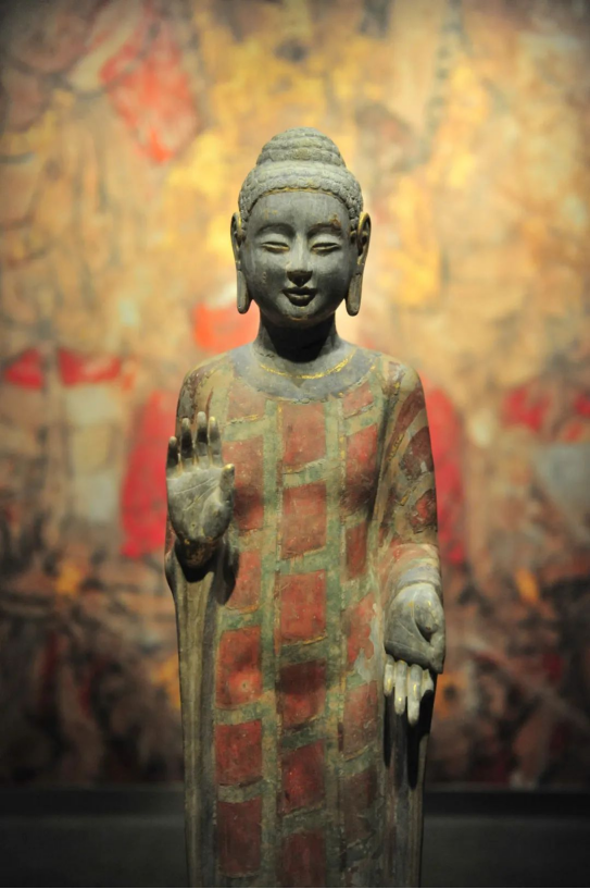 1996年龙兴寺遗址窖藏出土的400余尊佛教造像,是青州博物馆最为珍贵的藏品。龙兴寺石刻佛教造像群被评为1996年全国十大考古新发现,其数量之大、雕工之精、贴金彩绘保存之好为中国文物考古所罕见。在龙兴寺佛教造像展厅,一尊贴金彩绘石雕佛立像默然伫立,目光穿越千年,微笑凝望访客。