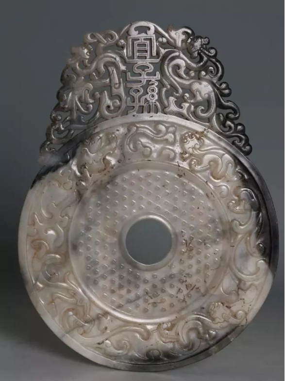 1982年潍坊青州市谭坊镇马家冢子东汉墓出土,白玉质,间有墨色,玉质温润,玉材罕见。圆形,出廓。璧肉内区饰158个乳丁,外区饰蟠螭纹。出廓上方镂雕双龙纽,纽中央透雕篆书“宜子孙”三字,乃“子子孙孙宜室宜家”的吉祥用语。龙体刚健,昂首挺胸,张口露齿呈腾空飞奔状,龙首面面相视。二龙造型均有中国风格,气派的S形构图技巧,线条流畅,生动活泼,姿态优美。该块玉璧以体形大、雕技精湛为世人所珍,为汉代玉璧的上乘之作,定为国家一级文物。
