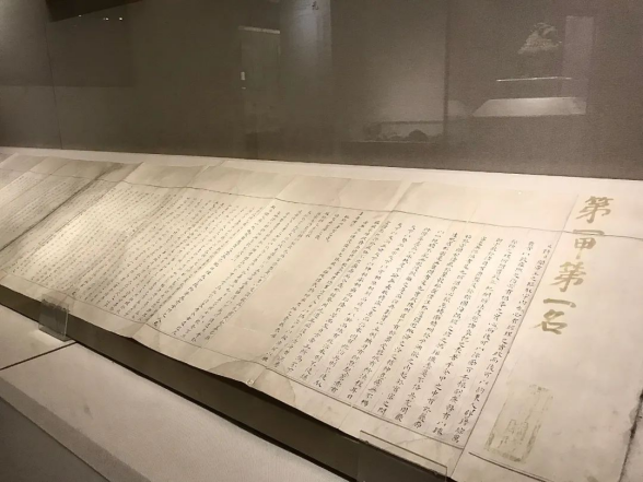 作为潍坊青州博物馆的“镇馆之宝”,明万历二十六年赵秉忠殿试卷属于国家一级文物,它填补了我国宫廷档案空白,是研究我国科举制度和明史的重要文献。“状元卷”共包含23折册页,分前后两大部分。前一部分是作者及其上三代的简历,为仿宋体书写。首折上方有礼部四字方印;后一部分是正文,全文共2460个字,用馆阁体小楷写成,字迹工整,无一笔误。在卷首有朱书“第一甲第一名”六个大字,为明万历皇帝亲笔御批。
