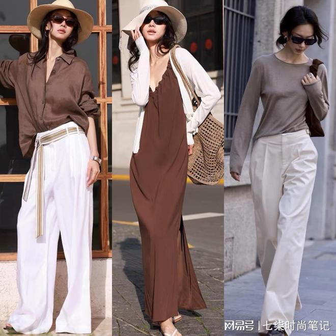 大地色在极简风穿搭中出镜率也很高,咖啡色的亚麻衬衫,质地轻盈且自带若有若无的微妙光泽感,与白色阔腿裤相搭配,营造出慵懒松弛不被拘束的自在惬意。