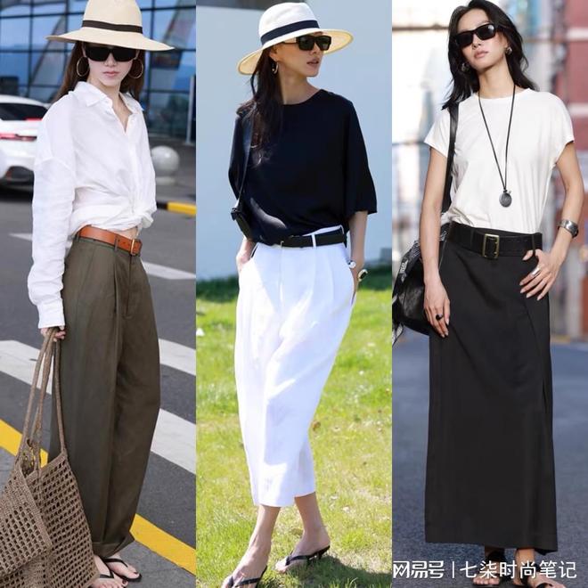 比如简单的黑白T恤、条纹T恤,搭配牛仔裤,简约清爽,日常可以快速出门。冷了可以加一件外套,想要增加气场,可以加一条皮质腰带,强调出高腰线的同时又能丰富穿搭层次。