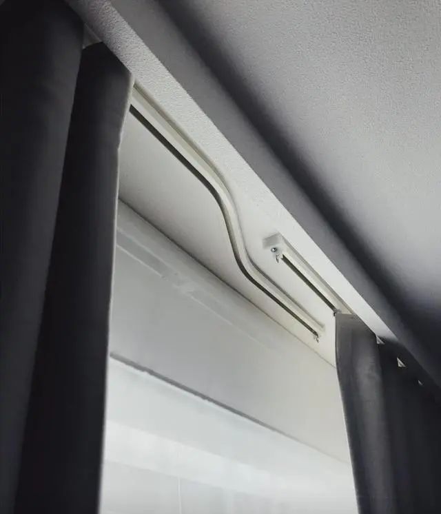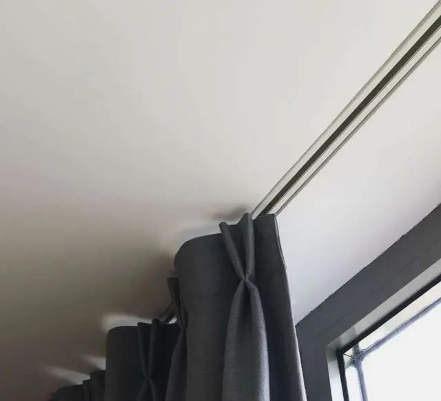 说到整体的美观性,窗帘盒自然是最佳的选择。但是,安装窗帘盒成本高,不够灵活,拉上窗帘显得空间没那么开阔。使用滑轨就很省钱,量好尺寸,网上订购,到货自己就能安装。