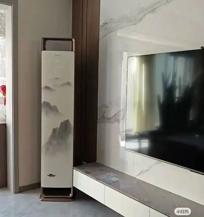 这款空调走的是“水墨丹青风”,纯白机身绘着山水墨韵,搭配淡金色边框,远远看去就像把中国山水画“焊”在了空调上。