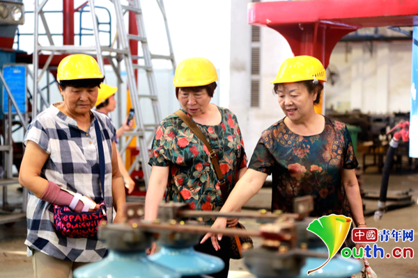 2018年,侯爱华、胡学政、白燕娥(从左至右)参观现代化铁路车间。中国青年网见习记者 李慧慧 摄
