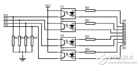 烟雾、煤气泄漏、红外等这些传感器的报警信号通过光电耦合接入单片机的P2 口,如图2-8 所示,在传感器没有报警信号时,光电耦合芯片处于截止状态,与之相接的单片机端口为低电平;当传感器有报警,传感器输出高电平,此时光电耦合芯片导通,与之相接的单片机端口为高电平,由单片机对报警信号进行采集并做出相应处理。