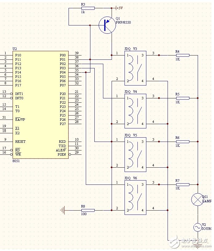 接收电路和调光电路的实现均是通过继电器实现的,给每一个继电器串联一个电阻,构成一个回路,本电路将四个继电器回路并联,连接在P0 口上,当四个继电器均闭合时,灯最亮,当三个继电器工作时,灯较亮,当两个继电器工作时灯次亮,当一个继电器工作时,灯最暗,当四个继电器都不工作时,灯泡处于关闭状态。接收电路图如图所示:
