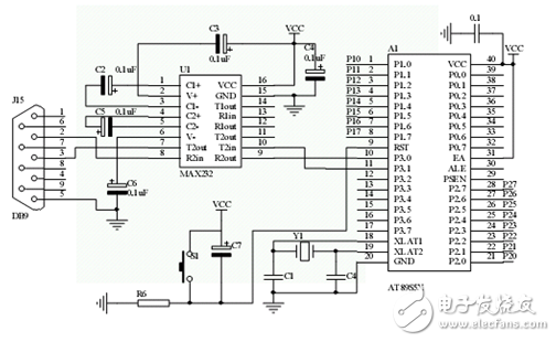 家电控制板采用串口与XSBase270实验箱进行通信,其采用了经典的兼容RS-232标准的MAX232($2.0686)芯片作为串口的电平转换芯片。电路的连接如图2-4所示: